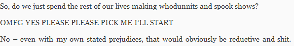 And I think if the answer to both these questions is ‘no’, then… why? Why will the world be worse off if this piece of art is never made? Why therefore is it worth your time, oh labouring writer, when it’s most likely a version of something you’re seen and really like and want to emulate?